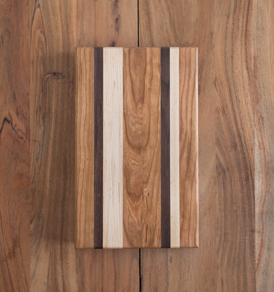 Board #1 features a three stripe cherry, maple, and walnut design, hand crafted from premium hardwood.