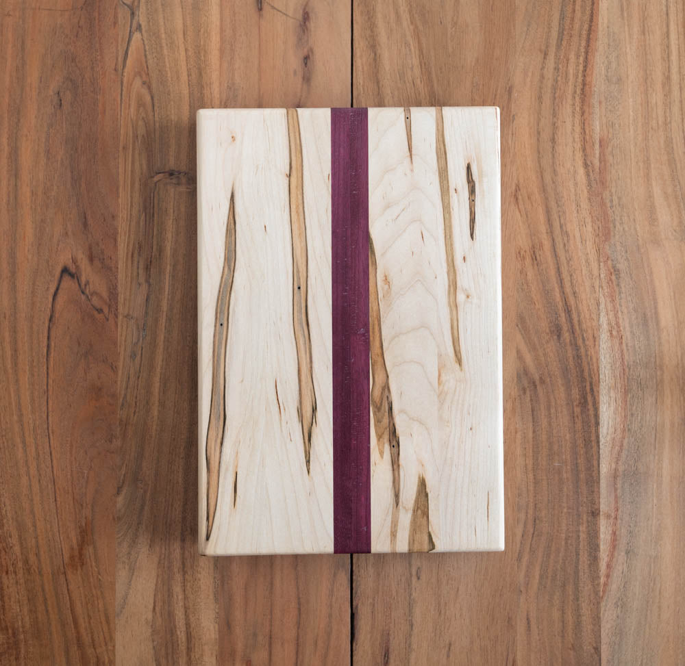 Board #5 features two naturally beautiful varieties of wood and showcases them as they were meant to be, natural. The large outer strips are made from Ambrosia Maple, a type of soft maple that boasts stunning dark grain paths. The accent strips of purpleheart complete this board, and highlight nature at its best. The purpleheart accent strips are not stained, this is the natural color of this South American hardwood.